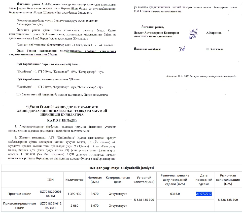 «В связи с успешным выполнением поставленных задач и учитывая рекомендацию наблюдательного совета Общества (протокол №58 от 13.11.2020г.) назначить (перевести) Гулямова Саидазима Миркамаловича (GULYAMOV SAIDAZIM MIRKAMALOVICH, паспорт АА0525408 от 13.12.2012г., выдан TOSHKENT SHAHAR XAMZA TUMANI IIB) на должность исполняющего обязанности генерального директора с 16 ноября 2020 года до утверждения в установленном порядке генерального директора на конкурсной основе.»
