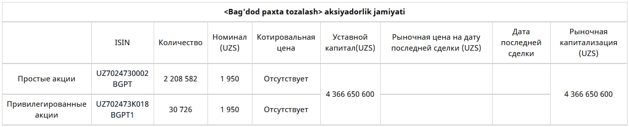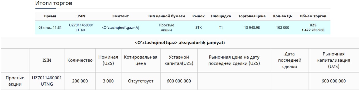 Цена за одну акцию АО [UTNG] составила 13 943,98 сум при номинале 3000 сум/шт.