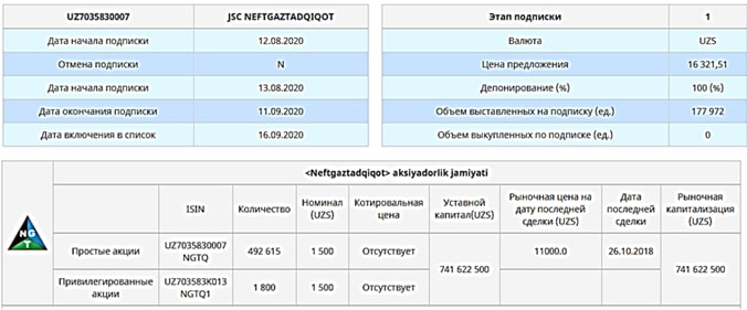 PS: Допуск к обращению акций АО «O'zlitineftgaz» на фондовой бирже был прекращён в августе 2019 года