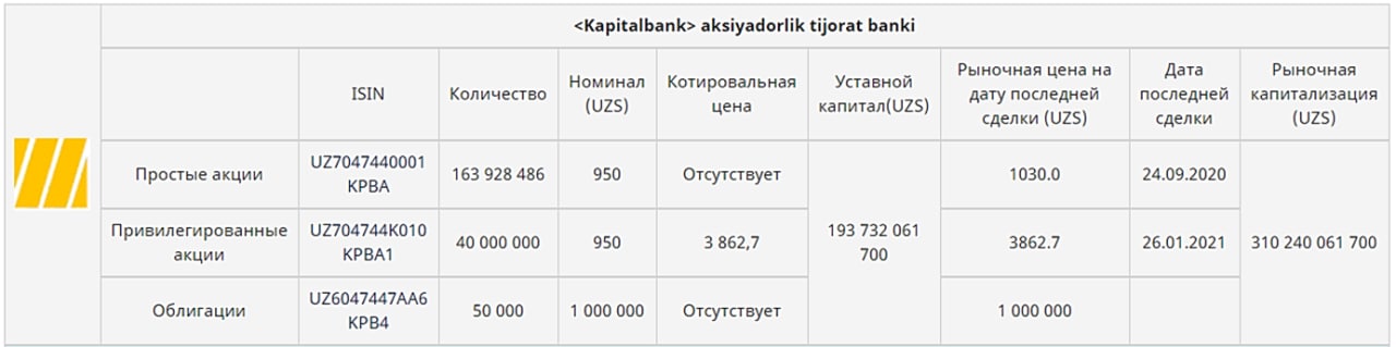 Предыдущая биржевая сделка с привил. акциями банка прошла 28.12.2020г. по цене 4 004,46 сум/шт (сумма сделки - 1,5 млрд. сум).