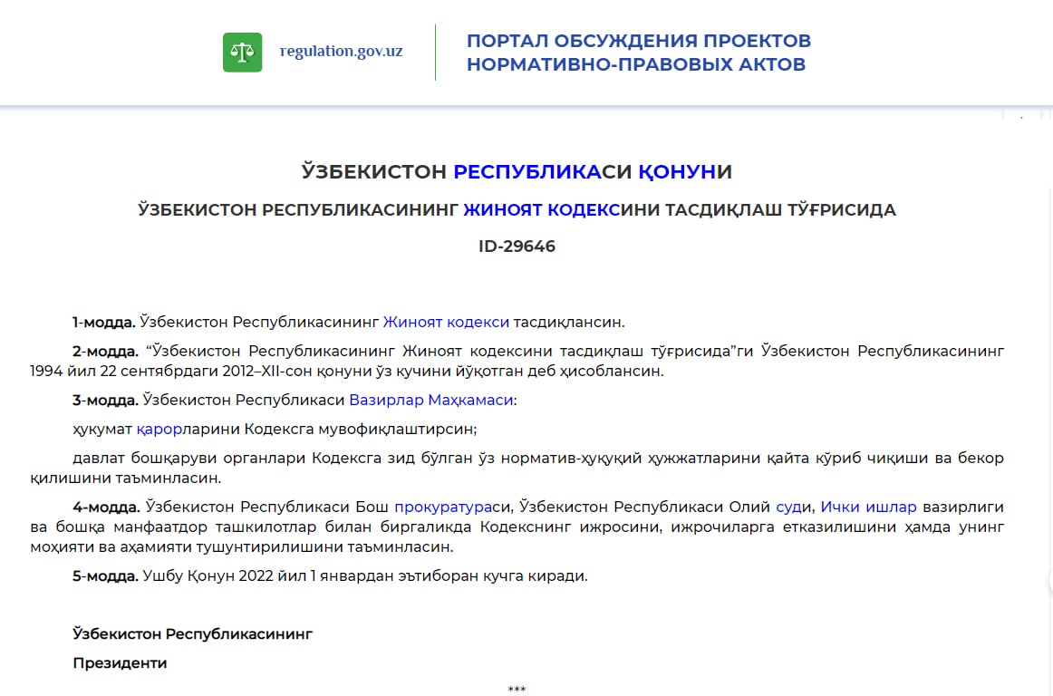 Проект новой редакции УК, пояснительная записка к нему и сопоставительная таблица изменений и дополнений в УК доступны в СОВАЗ на узбекском языке.