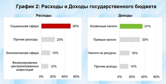 Расходы на выплату пенсий, оказание материальной помощи и компенсаций, а также повышение занятости, поддержка женщин и молодежи составили 5,1% (1,6% от ВВП), экономику – 8,6% (2,8%), централизованных инвестиций – 10,1% (3,3%), обслуживание госдолга – 0,9% или 0,3% к ВВП.