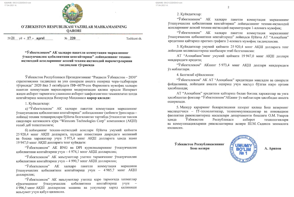 📶 Американская компания «Winncom Technologies Corp» стала победителем конкурса по расширению пропускной способности международного центра пакетной коммутации АО «Узбектелеком» (далее – Проект)