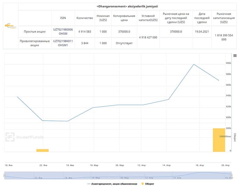 ⬇️ Текущая биржевая котировка на акции АО [OHSM]: 370 тыс. сум/шт при номинале 1000 сум/шт.