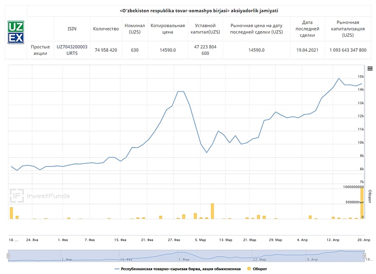 ⬆️ Текущая биржевая котировка на акции [URTS]: 14590 сум/шт при номинале 630 сум/шт