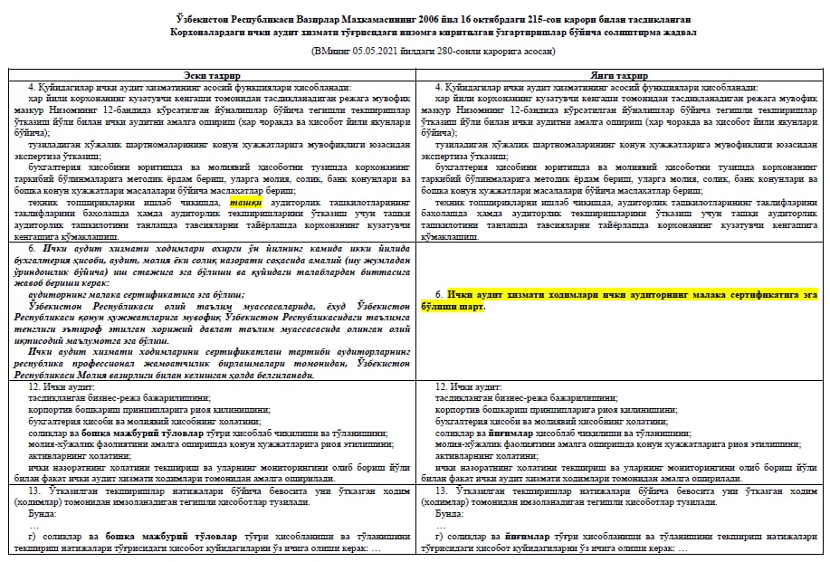 📜✍🏽 Постановлением КабМина от 05.05.2021г. №280 «О мерах по совершенствованию системы подготовки сотрудников службы внутреннего аудита» утверждено Положение о порядке проведения сертификации сотрудников службы внутреннего аудита.