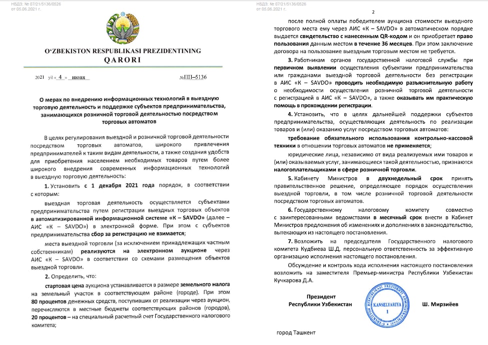 📜✍🏽 Согласно постановлению Президента РУз. от 04.06.2021г. №ПП-5136 «О мерах по внедрению информационных технологий в выездную торговую деятельность и поддержке субъектов предпринимательства, занимающихся розничной торговой деятельностью посредством торговых автоматов», с 1 декабря 2021 года: