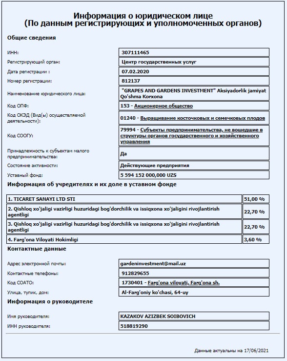 Сегодня, 16 июня, состоялась сделка купли-продажи акций АО «Grapes and gardens investment» (Фергана) на 2,85 млрд. сум.