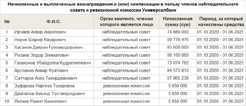 В состав комитета миноритарных акционеров банка избраны сроком на один год Рафиқжонов Сардор Садриддин ўғли, Назиров Иқболжон Саипназарович , Мамажонов Зохиржон Зокиржонович.