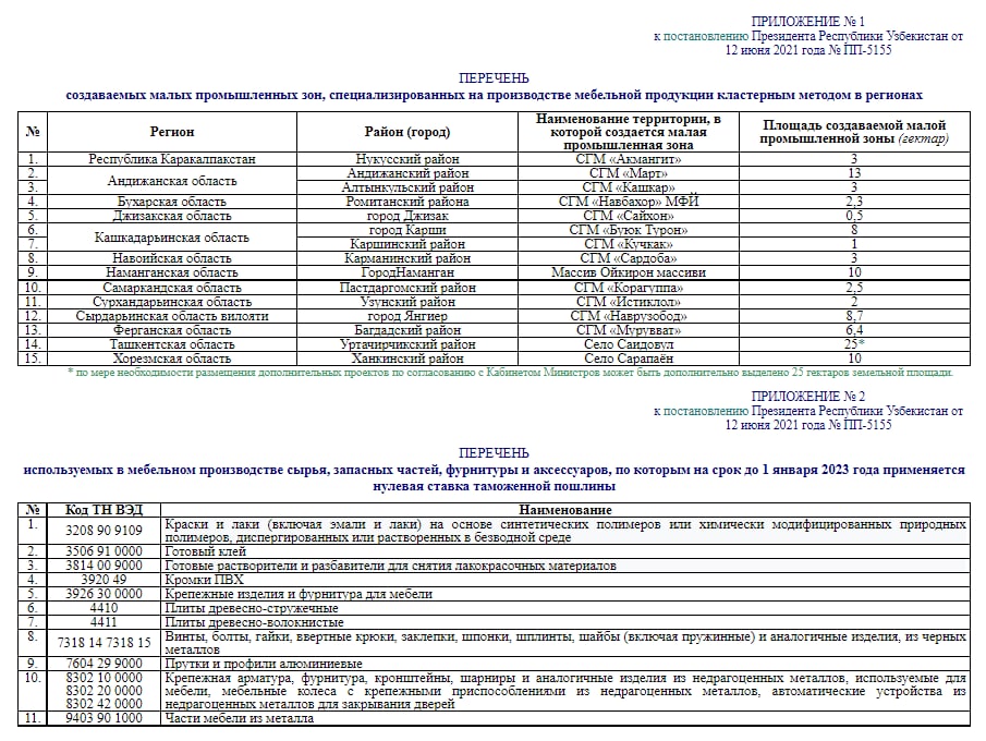 📜✍🏽 Постановлением Президента РУз. от 21.06.2021г. №ПП-5155 «О мерах, направленных на развитие мебельной промышленности в регионах республики» дано согласие на создание 15 малых промышленных зон (МПЗ), специализированных на производстве мебельной продукции кластерным методом в регионах [см на фото].