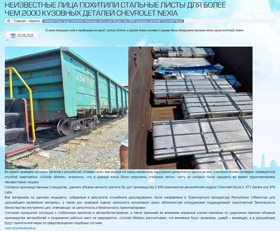 Государственный холдинг АО «Узавтосаноат» 25 июня т.г. опубликовал на своём официальном веб-сайте о хищении стали, которая хватило бы для производства 2030 компонентов автомобилей модели Chevrolet «Nexia-3», 871 «Gentra» или 970 «Labo».