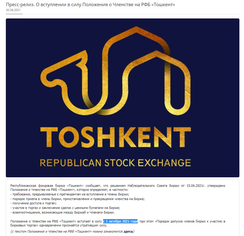РФБ в объявлении указывает, что Положение о членстве на РФБ «Тошкент» вступает в силу с 01.10.2021г., при этом «Порядок допуска членов биржи к участию в биржевых торгах» одновременно признаётся утратившим силу. Однако, в пункте 39 опубликованного текста Положения установлено, что Положение вводится в действие по истечении 90 дней после его утверждения и публикации на официальном веб-сайте Биржи.