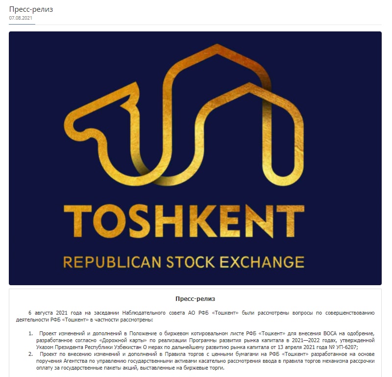 Набсоветом РФБ при рассмотрении вопроса по внесению изменений и дополнений в Правила торгов с ценными бумагами принято к сведению, что в соответствии с пунктом 12 указа Президента РУз. от 27.10.2020г. №УП-6096 покупатели госактивов могут производить оплату на условиях рассрочки платежей в порядке, установленном законодательством. РФБ отмечает, что согласно указу Президента РУз. от 19.02.2019г. №УП-5666, при оплате выкупных платежей за госдоли (определяется) допускается рассрочка оплаты выкупных платежей, в зависимости от суммы выкупного платежа до трёх лет*. При этом в соответствии с пунктом 3.3. протокола заседания Гостендерной комиссии от 28.05.2021г. АУГА уполномочено применять порядок рассрочки оплаты выкупных платежей, приведенный в указе Президента РУз. от 19.02.2019г. №УП-5666*, за госпакеты акций, выставленные на публичные биржевые торги.