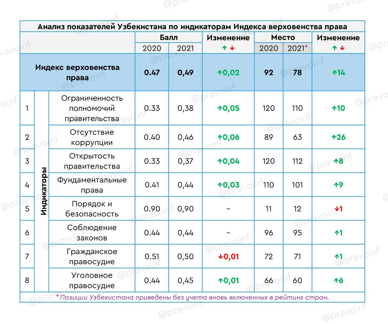 📊 В рейтинге верховенства права 2021 года, опубликованном World Justice Project 14 октября, Узбекистан поднялся на 14 позиций.