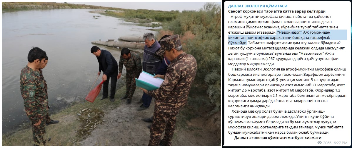 В начале октября т.г., жители Карманинского района обнаружили изменение цвета воды в реке и мёртвую рыбу, разбросанную по берегам реки. Оперативная группа Госкомэкологии выехала на место и по результатам анализа образцов воды из 5 точек реки подтвердила факт массового слива в реку Зарафшан химикатов, содержащих аммонийный азот (в 21 раз выше нормы), нитрат азота (в 2,6 раз в/н), нитрит азота (в 60 раз в/н), хлорид (в 1,3 раза в/н), ионы меди (в 2,1 раза в/н).