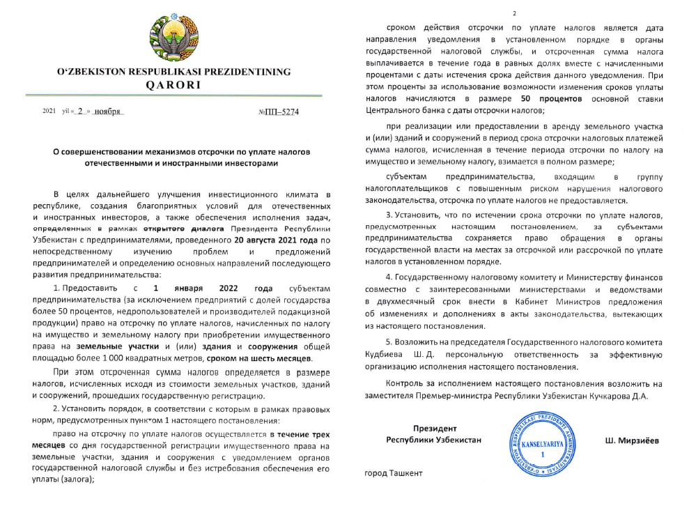 📜✍🏽 Постановлением Президента РУз. от 02.11.2021г. №ПП-5274 «О совершенствовании механизмов отсрочки по уплате налогов отечественными и иностранными инвесторами» с 01.01.2022г. субъектам предпринимательства (за исключением предприятий с госдолей более 50%, недропользователей и производителей подакцизной продукции) предоставляется право на отсрочку по уплате налогов, начисленных по налогу на имущество и земельному налогу при приобретении имущественного права на земельные участки и (или) здания и сооружения общей площадью более 1000 квадратных метров, сроком на 6 месяцев. При этом отсроченная сумма налогов определяется в размере налогов, исчисленных исходя из стоимости земельных участков, зданий и сооружений, прошедших госрегистрацию.