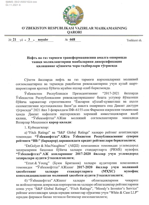 📜✍🏽 Постановлением Кабинета Министров РУз. от 03.11.2021г. №668 принято к сведению, что для организации выпуска и размещения международных облигаций АО «Узбекнефтегаз»: