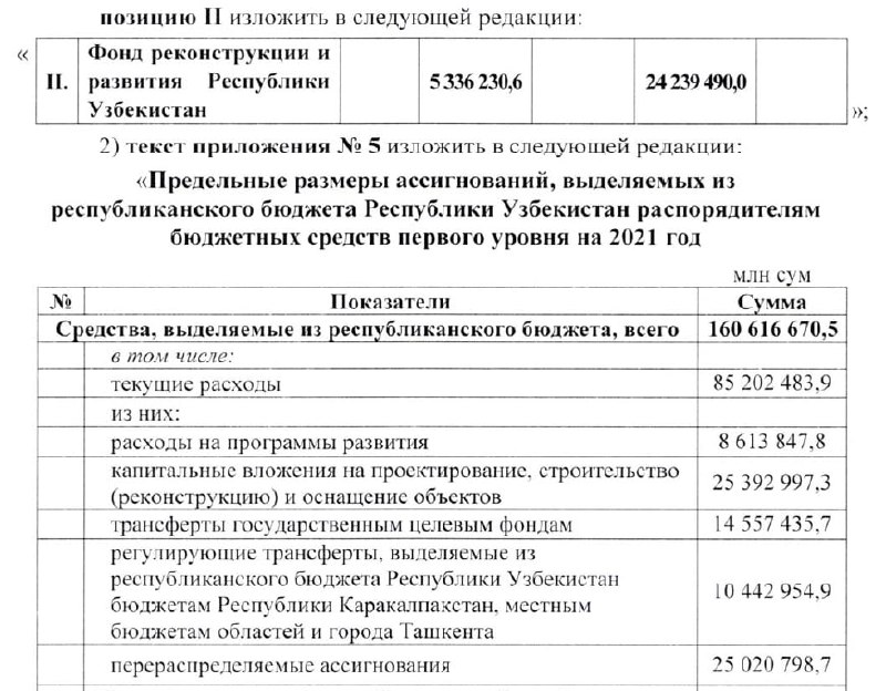 Также, в новой редакции даны Предельные размеры ассигнований, выделяемых из республиканского бюджета распорядителям бюджетных средств первого уровня на 2021 год. Так, выделяемые из республиканского бюджета госорганам средства увеличились со 148,92 трлн. сум до 160,61 трлн. сум за счёт увеличения текущих расходов (с 80,90 трлн. сум до 85,20 трлн. сум) и перераспределяемых ассигнований (с 19,43 трлн. сум до 25,02 трлн. сум).