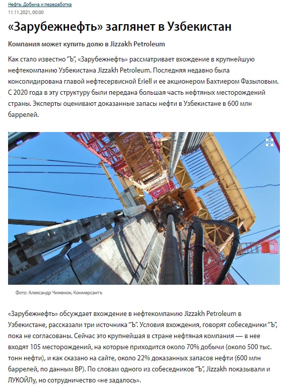 Российское АО «Зарубежнефть», в котором государство является единственным акционером, обсуждает вхождение в нефтекомпанию «Jizzakh Petroleum» в Узбекистане. Условия вхождения пока не согласованы. Сейчас «Jizzakh Petroleum» крупнейшая в стране нефтяная компания — в неё входят 105 месторождений, на которые приходится около 70% добычи (около 500 тыс. тонн нефти), и как сказано на сайте, около 22% доказанных запасов нефти (600 млн баррелей, по данным BP).