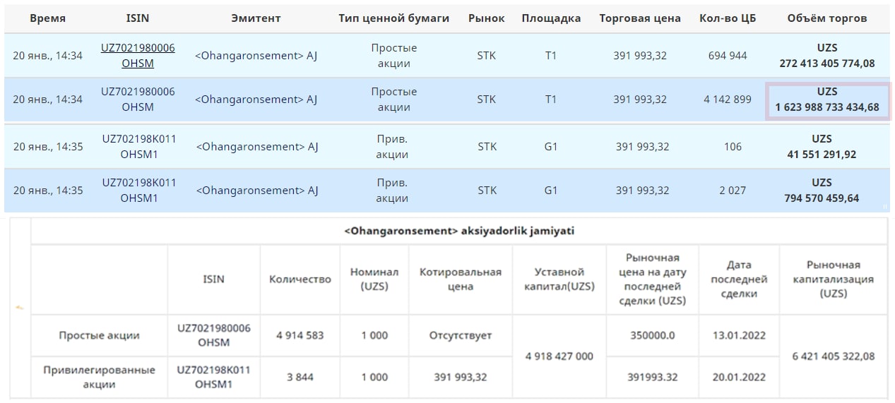 Напомним, что 13 января т.г. иностранные компании «Giacinttar Limited» и «Lamanka Enterprises Limited» объявляли о предстоящих сделках купли-продажи пакетов акций АО «Ахангаранцемент» в размере соответственно 14,13% и 84,23% от уставного капитала АО. Минимальная цена, с учётом изменения курса иностранной валюты, была определена в размере 390 000 сум за 1 акцию АО [#].