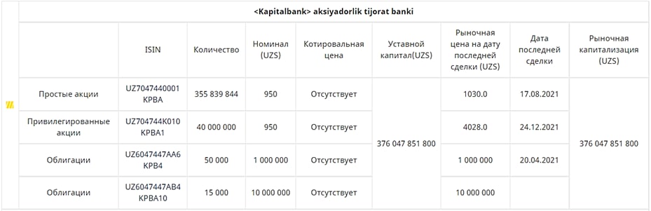 Примечательно, что котировальной цены на акции Банка нет, а последняя биржевая сделка на стандартной торговой площадке (G1) с простыми акциями Банка зарегистрирована 17.08.2021г. (1030 сум/шт).
