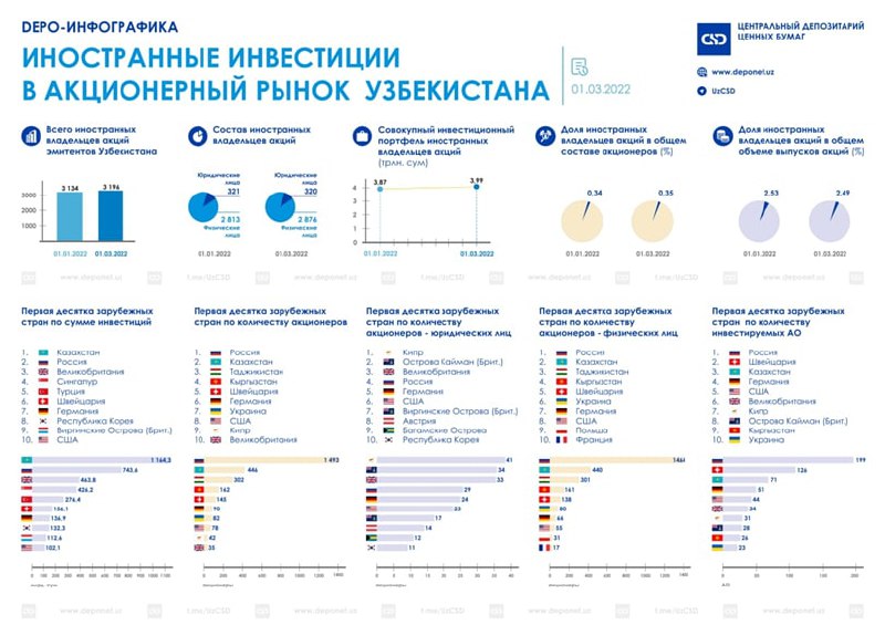 По данным Центрального депозитария ценных бумаг на 01.03.2022г., среди стран-инвесторов в Узбекистан лидирующие позиции, как и прежде, занимает Россия: