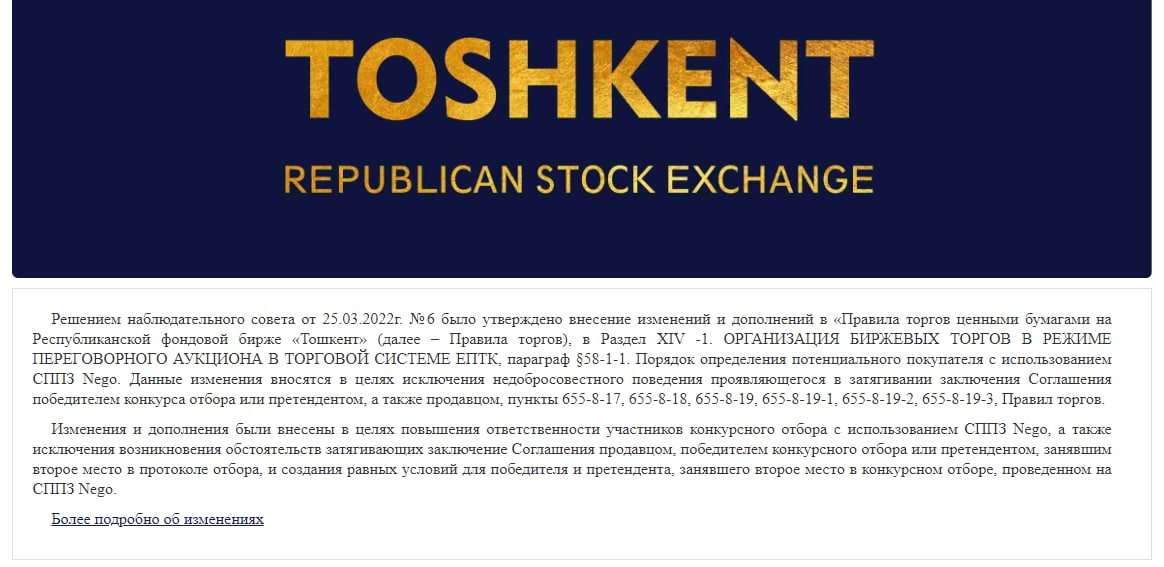 По решению наблюдательного совета Республиканской фондовой биржи «Тошкент» от 25.03.2022г. утверждены изменения и дополнения в Правила торгов ценными бумагами на бирже.