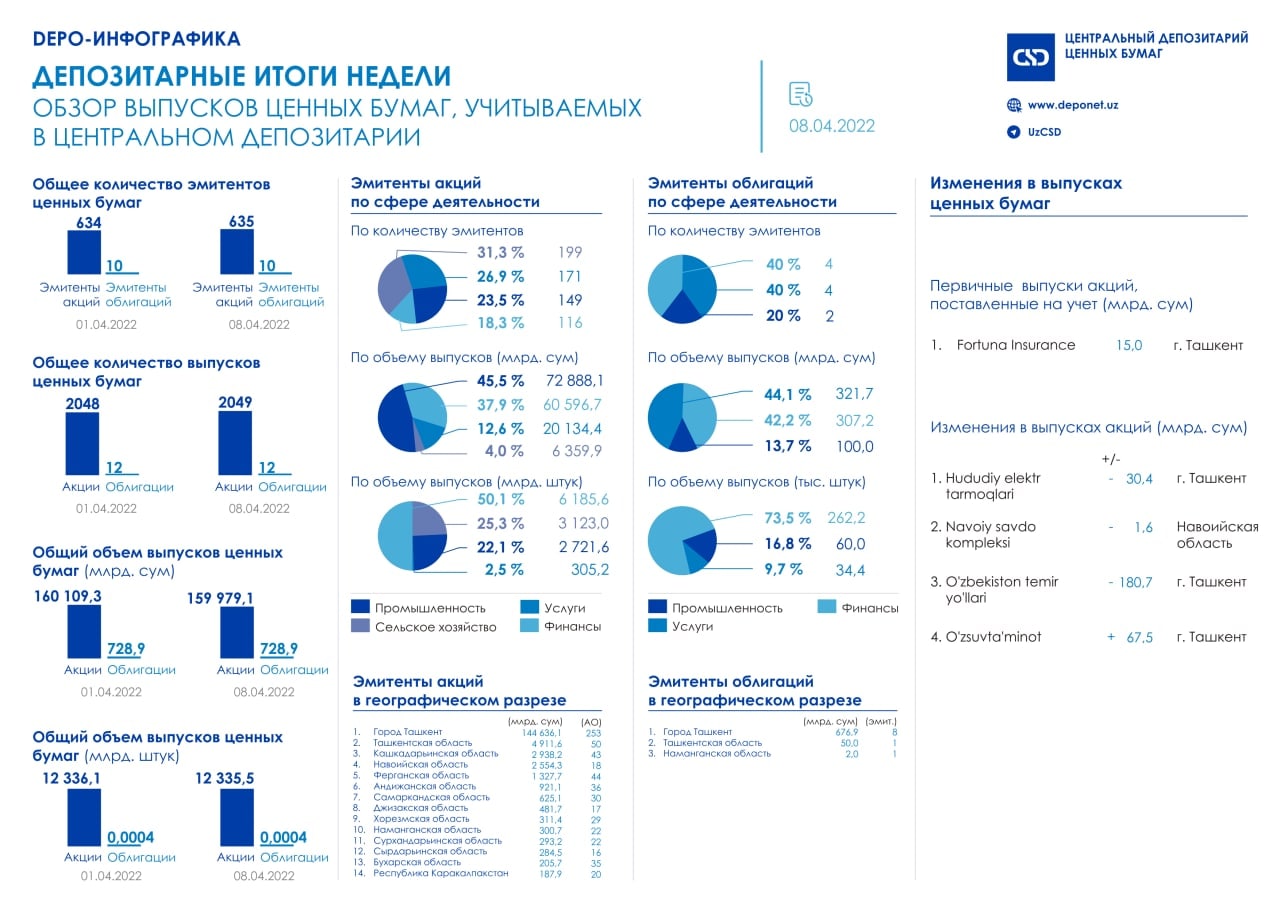 По состоянию на 08.04.2022г. общий объём выпусков акций в Узбекистане составил 159,9 трлн сумов и уменьшился за неделю на 130,2 млрд сумов.