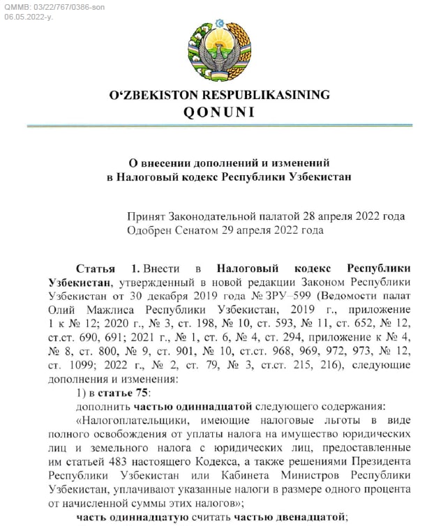 📜✍🏽 5 мая т.г. Президент РУз подписал Закон «О внесении изменений и дополнений в Налоговый кодекс Республики Узбекистан», принятый Законодательной палатой 28 апреля и одобренный Сенатом 29 апреля 2022 года.