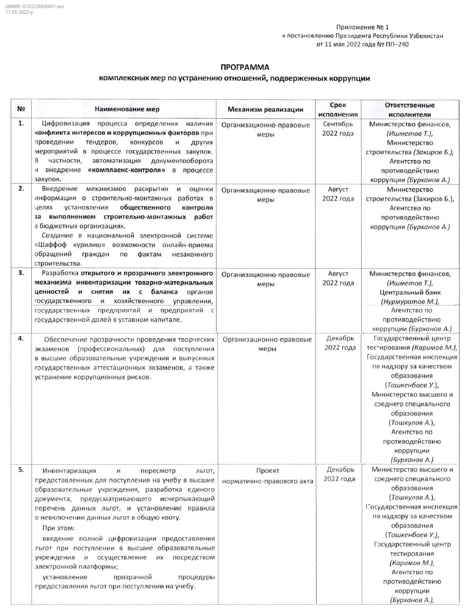 📜✍🏽 Президент Узбекистан подписал постановление «О мерах по совершенствованию механизмов устранения коррупционных рисков в области государственного управления и расширению участия общественности в данной сфере» от 11.05.2022г. №ПП-240.
