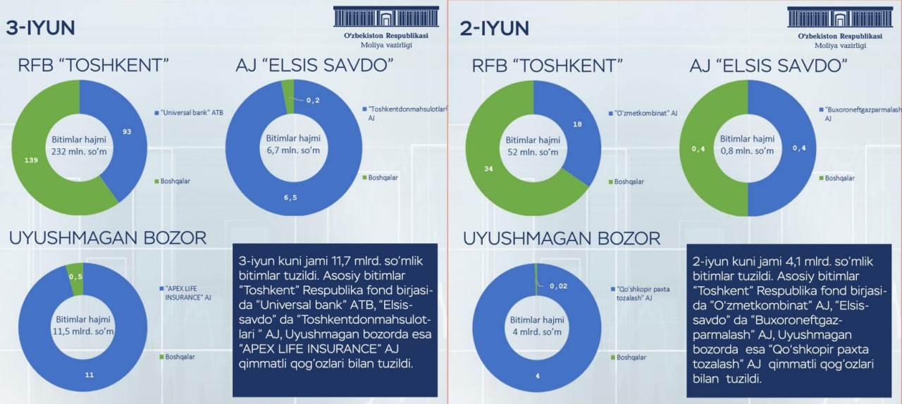 Сегодня, 3 июня, зарегистрирована внебиржевая сделка по размещению акций Страховой компании «Apex Life Insurance» по номинальной стоимости - 11,0 млрд сумов. Выпуск данных акций был зарегистрирован 20.05.2022г.