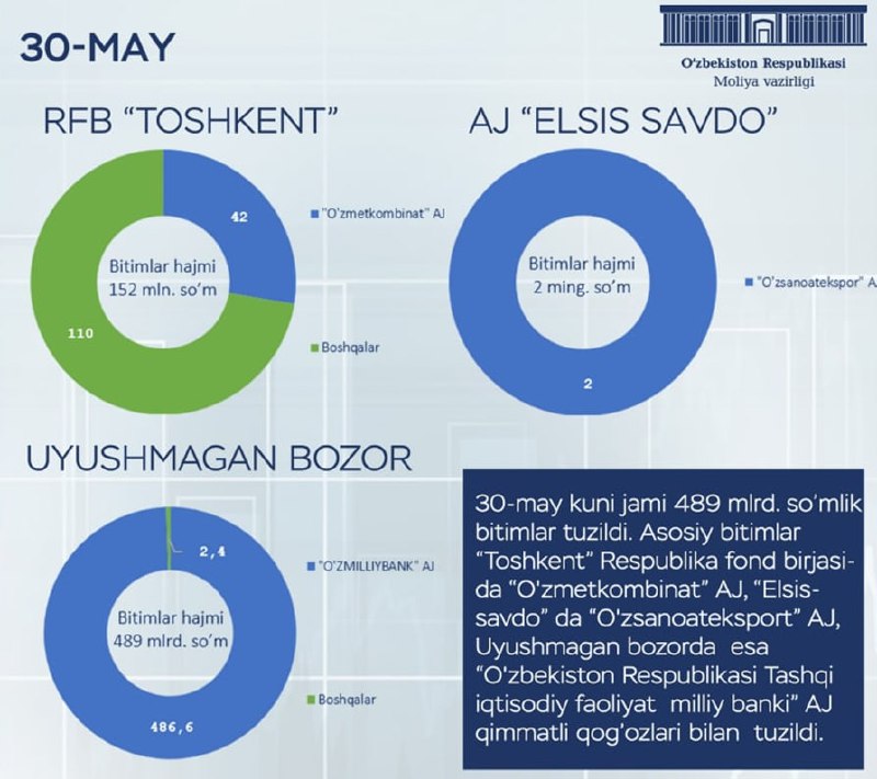 Сегодня, 30 мая, зарегистрирована внебиржевая сделка по размещению простых акций Национального банка ВЭД РУз на общую сумму 486,5 млрд сумов.