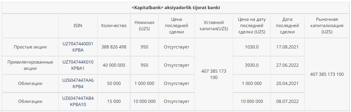Сегодня на фондовой бирже зарегистрирована сделка на 61,80 млрд сумов с корпоративными облигациями АКБ «Капиталбанк» (41,2% всего выпуска KPBA10). Цена облигации Банка в сделке была равна её номинальной стоимости, а именно 10 млн сумов за 1 штуку.