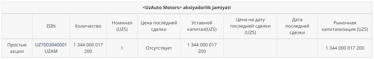 10 октября единственным акционером АО «UzAuto Motors» принято решение выпустить дополнительные акции на 5,99 млрд сумов (по номинальной стоимости), размещаемых акционеру – ООО «UzAuto Passenger Vehicles Management» (100% дочка Узавтосаноат) в счёт реинвестиции (капитализации) части нераспределённой прибыли АО