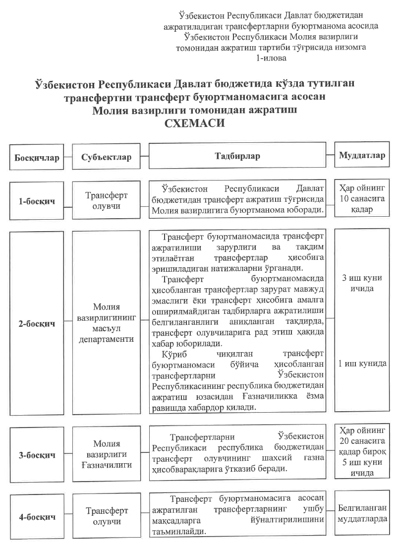 📜✍🏽 Постановлением Кабинета Министров РУз от 28.10.2022 г. №627 утверждено Положение о порядке распределения Минфином трансфертов, выделенных из Госбюджета (Давлат бюджетидан ажратиладиган трансфертларни буюртманома асосида Молия вазирлиги томонидан ажратиш тартиби тўғрисидаги низом)