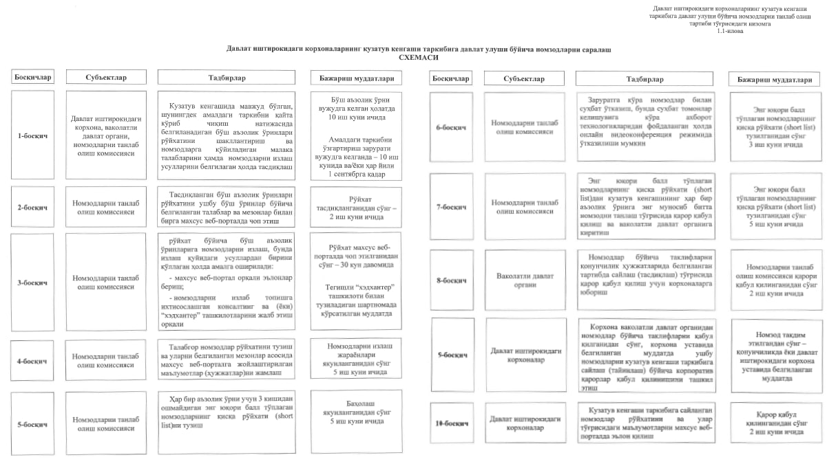 📋 Қарор билан Давлат иштирокидаги корхоналарнинг кузатув кенгаши таркибига давлат улуши бўйича номзодларни танлаб олиш тартиби тўғрисидаги низом тасдиқланди.
