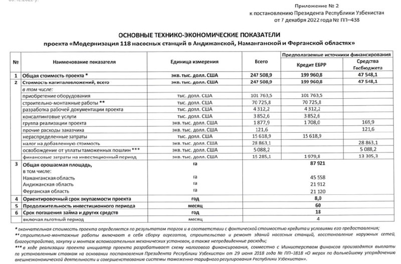 Напомним, что на основании постановления Президента РУз от 01.12.2022г. №ПП-434 утратило силу постановление от 29.07.2021г. №ПП-5201 «О мерах по реализации проектов модернизации 95 насосных станций в Бухарской, Навоийской, Кашкадарьинской, Самаркандской и Сурхандарьинской областях с участием Государственной корпорации развития Российской Федерации «ВЭБ.РФ». Общая стоимость данных проектов была определена в размере 213,5 млн евро, из них 146 млн евро — кредит Внешэкономбанка (Россия), 67,5 млн евро — вклад Узбекистана, в том числе 33,7 млн евро — в форме покрытия НДС и освобождения от уплаты таможенных пошлин [#].