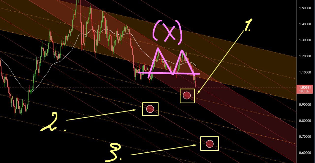 2) Если месячный блок поддержки из п. №1 не устоит, следующей целью выступает блок №2 с целевым диапазоном 0.85-0.9. Здесь же будет закрыта последняя месячная дырка с 1986 года. При таком курсе ЕС ждет такой долговой кризис, при котором его аналог от 2010 года покажется цветочками. В настоящий момент я считаю это крайним диапазоном который мы можем увидеть по евро, ниже мировые ЦБ вряд ли опустят, пойдут жесткие интервенции