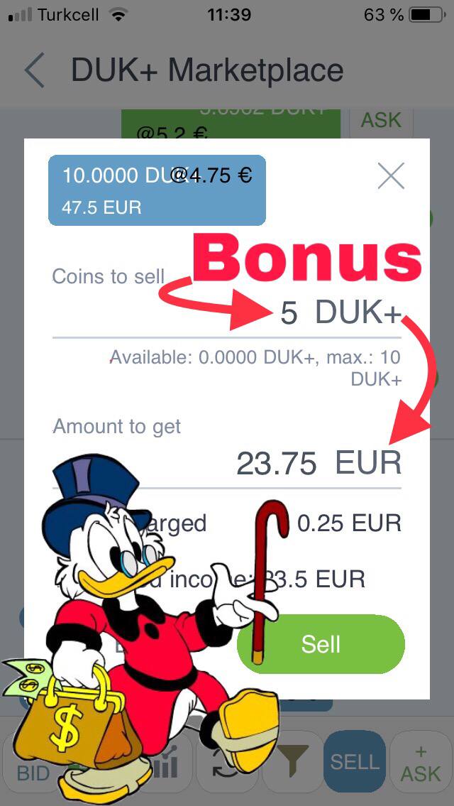 4. В течение 3 или 5 часов ваш "АККАУНТ" будет подтвержден, и вы получите 5 DUK, и вы можете сразу продать (5 DUK = €17.20 евро) и вывести деньги на свой кошелек 100%.