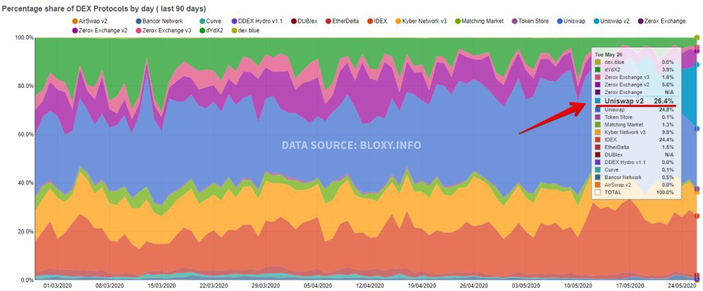 As of May 26, the protocol takes ~ 26% of all DEX trades on Ethereum by count and ~ 6% by volume.