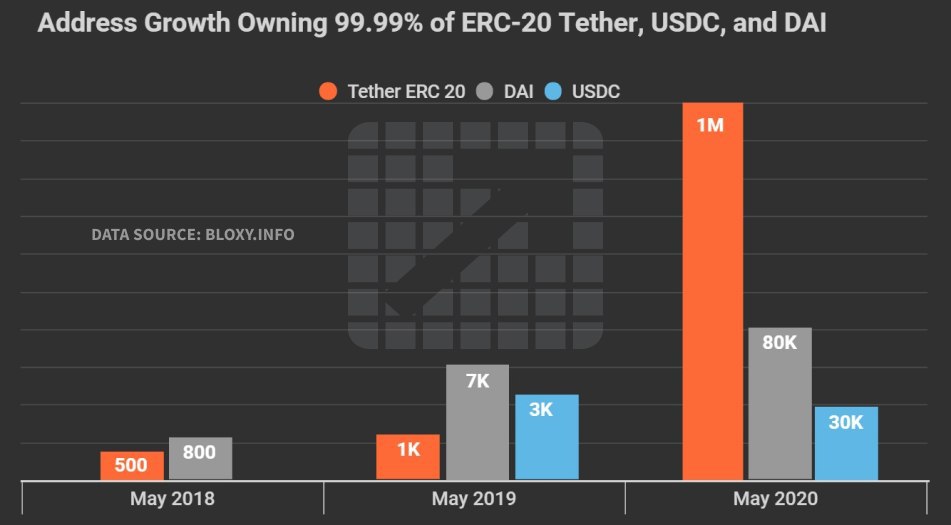 The same dynamics can be viewed with USDC addresses: 3k in May 2019 vs 30k in May 2020 or 1000% for 1 year.