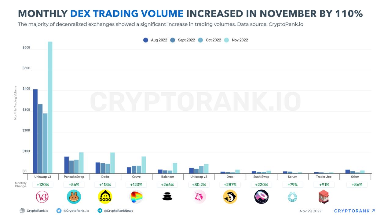 At the same time, the positions of the leaders remain unaffected by the market sentiment. According to the data from CryptoRank.io, Uniswap V3 and PancakeSwap are still leading in terms of trading volume, together they accounted for over 69% of DEX trading volume in November. Orca and Balancer showed the highest increase of trading volumes in November.