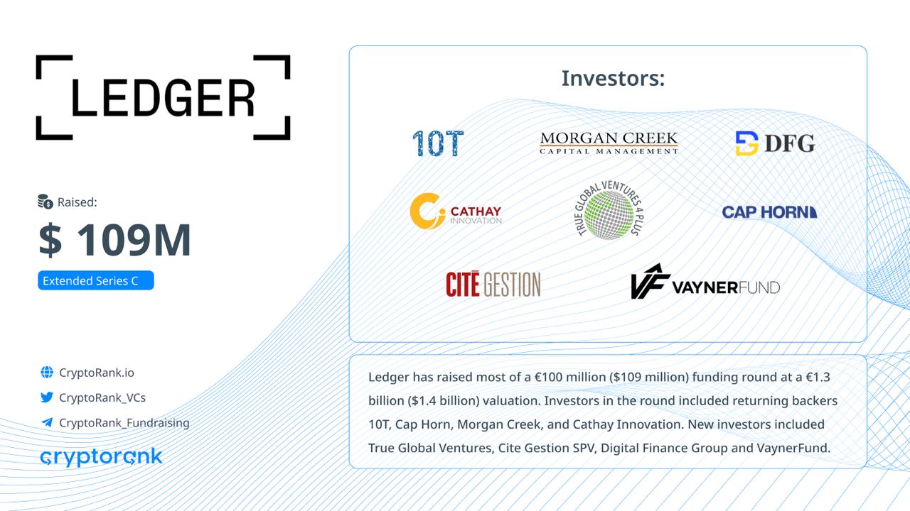 Ledger has raised most of a €100 million ($109 million) funding round at a €1.3 billion ($1.4 billion) valuation. Investors in the round included returning backers 10T, Cap Horn, Morgan Creek, and Cathay Innovation. New investors included True Global Ventures, Cite Gestion SPV, Digital Finance Group and VaynerFund.