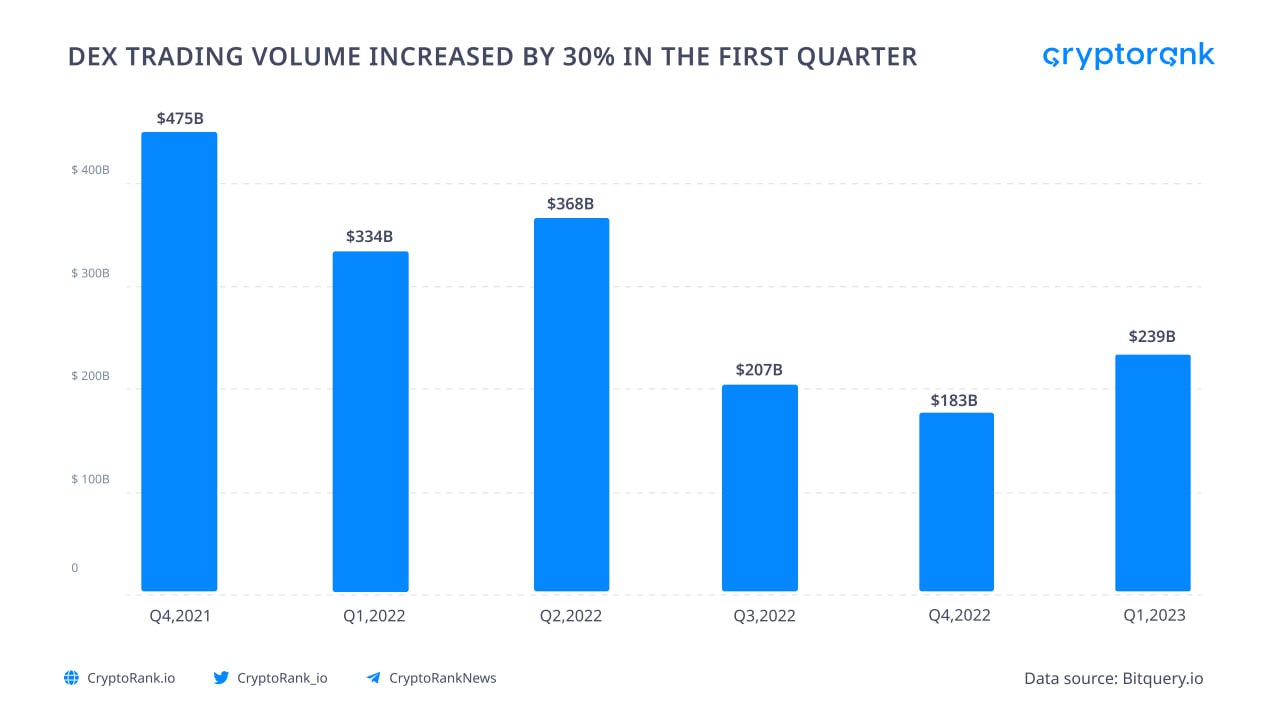 According to Bitquery data, The decentralized exchange (DEX) market has seen significant growth in the first quarter of this year, with trading volume increasing by 30.6%