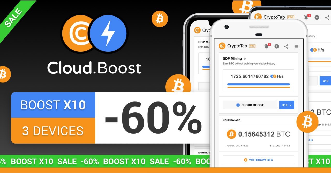 Mine in CryptoTab 10 times faster, earn way more bitcoins on the same device—with the Cloud.Boost feature. Hurry up to get the Cloud.Boost feature for up to 3 devices with a crazy 60% discount!