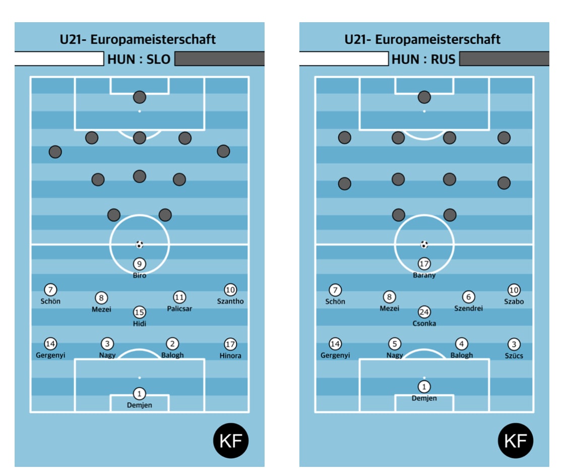 Саболч Шён и Саболч Мезей — это два имени, которые стоит запомнить. Шён постоянно хорошо проявляет себя в ситуациях 1 vs 1 на фланге, а Мезей предлагает хорошие варианты в центре поля. При игре с мячом два центральных защитника располагаются глубоко и широко, фланговые защитники поднимаются выше. В качестве опорного полузащитника, который располагается ближе к штрафной, выступает Хиди или Чонка. Без мяча венгры используют средний блок.