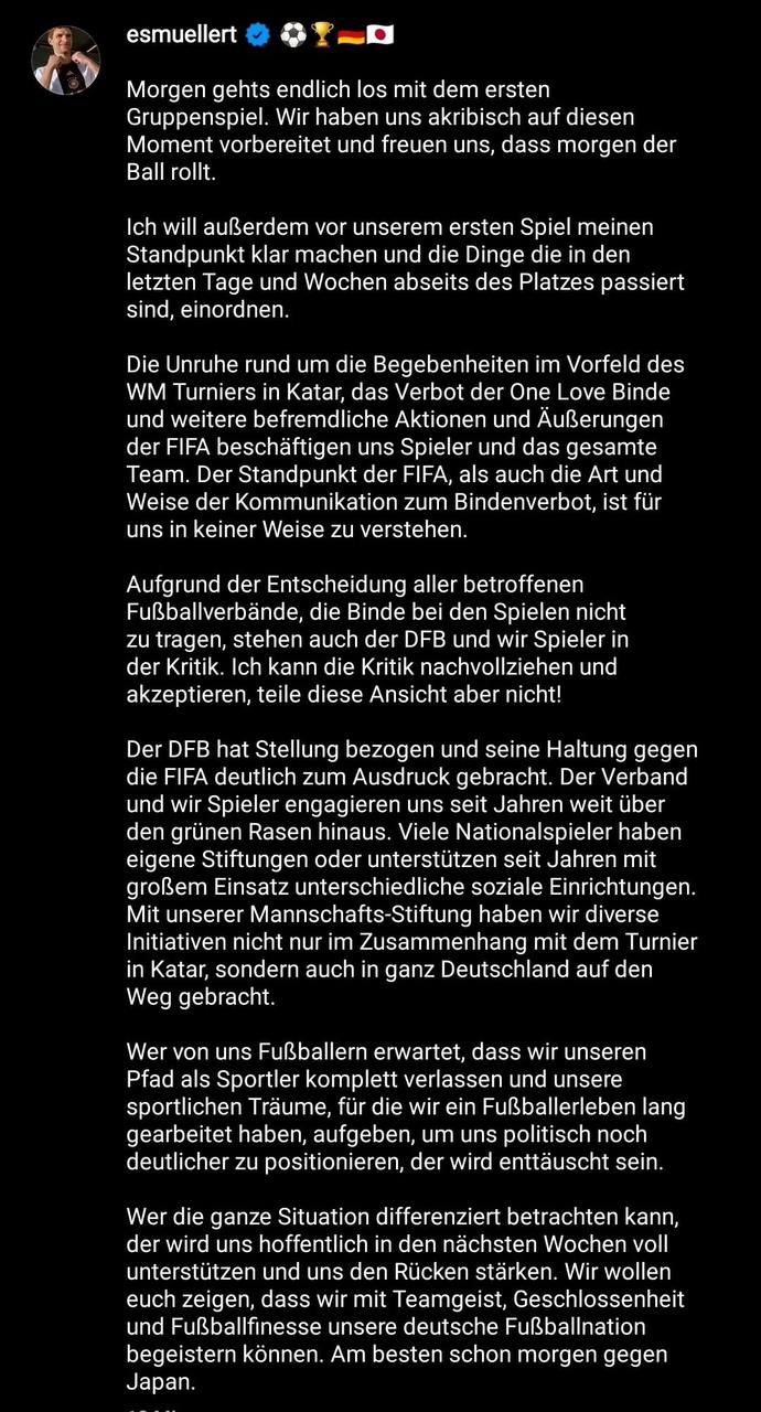 DFB четко обозначил и занял свою позицию против ФИФА. Ассоциация и мы, игроки, на протяжении многих лет социально активны далеко за пределами поля. Многие игроки сборной имеют свои собственные фонды или на протяжении многих лет с большой отдачей поддерживают различные социальные учреждения. Вместе с фондом нашей команды мы выступили с различными инициативами не только в связи с турниром в Катаре, но и по всей Германии.