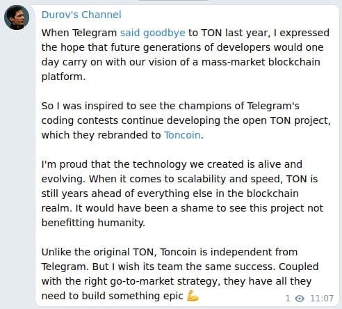 Sono orgoglioso che la tecnologia che abbiamo creato sia viva e in evoluzione. Quando si tratta di scalabilità e velocità, TON è ancora anni avanti a tutto il resto nel regno della blockchain. Sarebbe stato un peccato vedere questo progetto non beneficiare l'umanità.