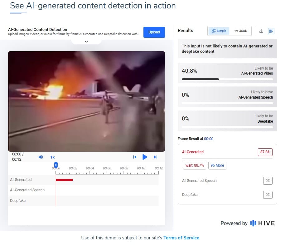12-секундный ролик распространяется в низком качестве, поэтому сложно детально рассмотреть происходящее. Фактчекер BBC Шаян Сардаризаде назвал это видео ИИ-подделкой, так как оно содержит «несколько заметных ошибок», но детекторы (например, Hive) дают противоречивые результаты. «Проверено» выяснило, что изначально ролик был иначе кадрирован и на пару секунд короче (вероятно, потом его специально замедлили). Наиболее ранний пост, который мы нашли, появился 9 марта в X: там на урду говорилось об уничтожении базы в Хайфе. В нижней части записи стоял англоязычный дисклеймер: «Это видео смонтировано в демонстрационных целях, его не надо воспринимать всерьёз».