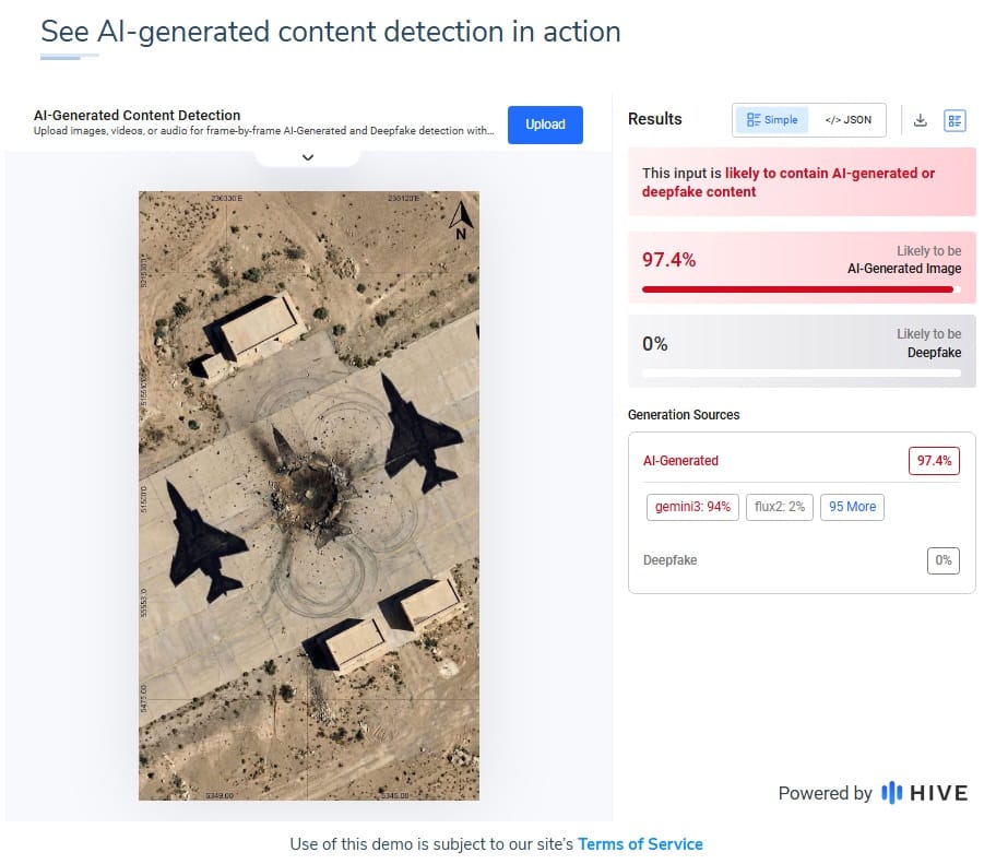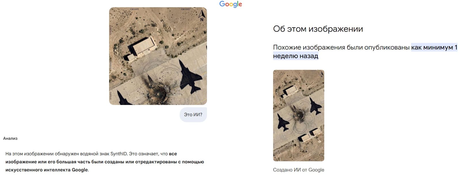 Эти выводы, которые даже в случае SynthID могут быть ложноположительными, подтверждают и другие аргументы. Так, геомаркеры по краям снимка — это бессмысленный набор символов (широты и долготы не соответствуют ни одной системе координат или известной локации). В Сети встречаются и другие снимки, якобы показывающие последствия ударов по нарисованным самолётам и вертолётам, — но и они, пишут фактчекеры AFP, были сфальсифицированы.